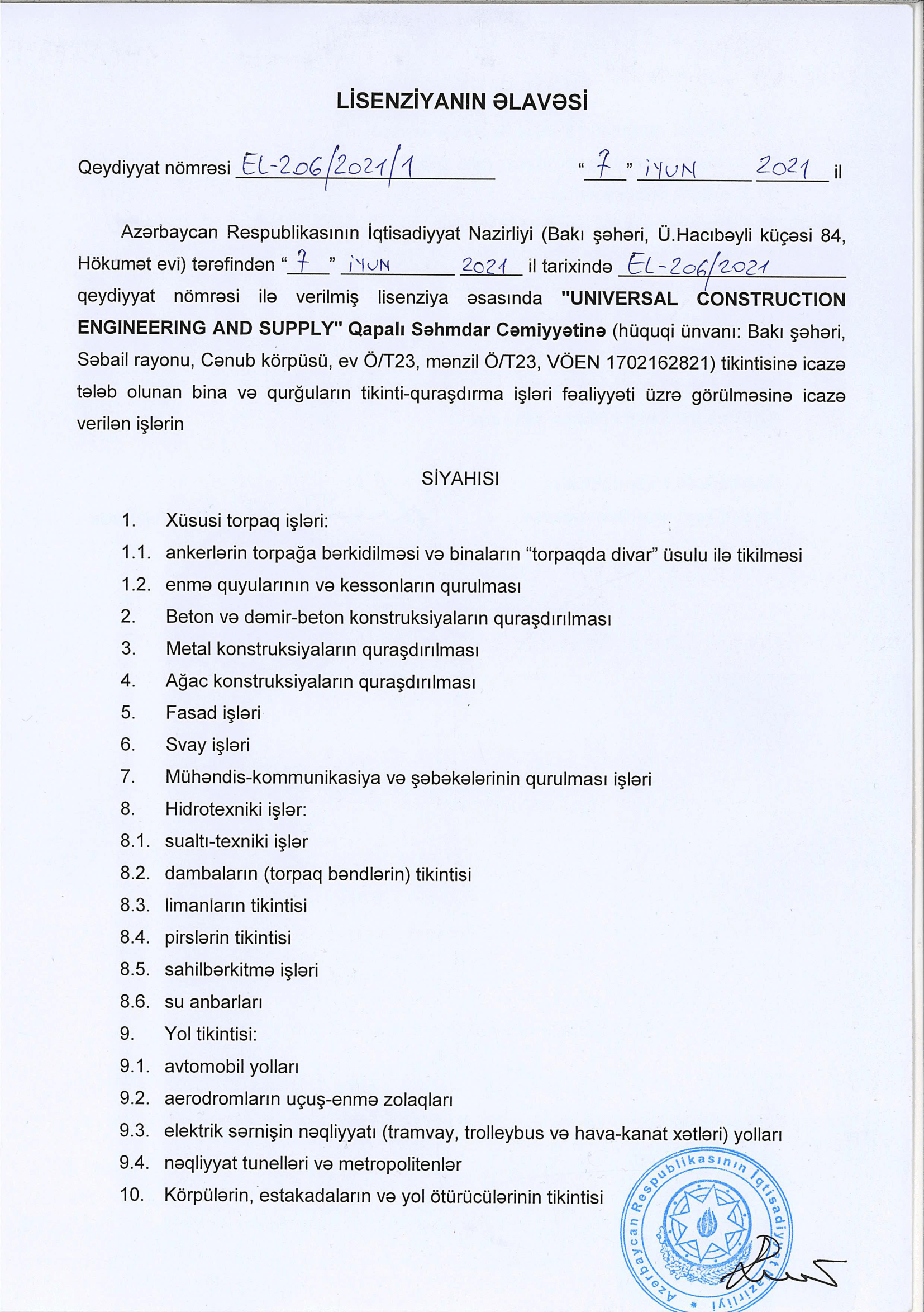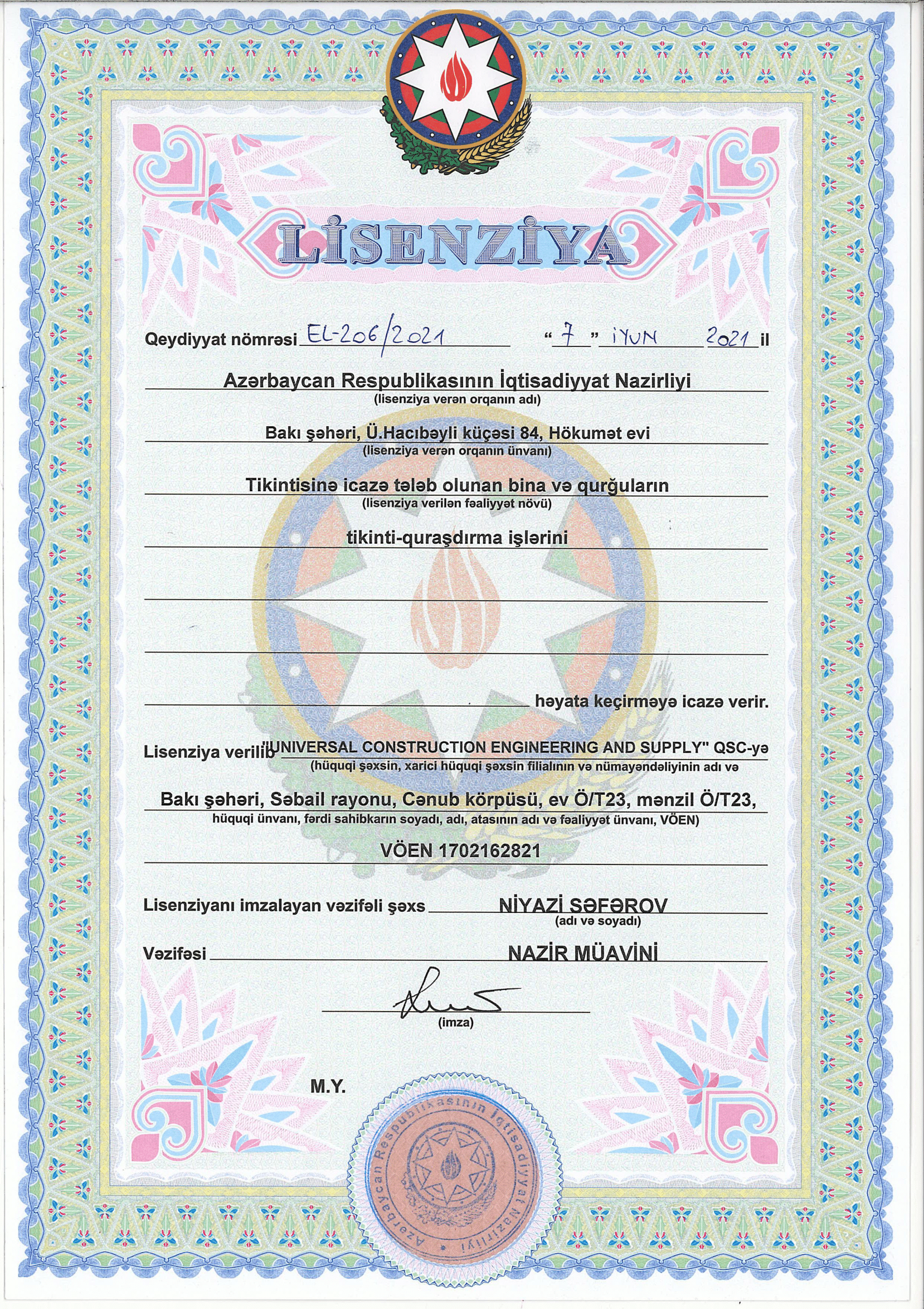 Bu gün "Universal Construction Engineering and Supply " QSC şirkəti sabit və dinamik inkişaf edən müəssisədir. O, inkişaf etmiş struktura, eləcə də layihə-smeta sənədlərinin yaradılması mərhələsindən tutmuş, obyektlər istismara verilənədək təmir-tikinti işlər kompleksinin aparılması üçün lazım olan beynəlxalq tərəfdaşlara malikdir.